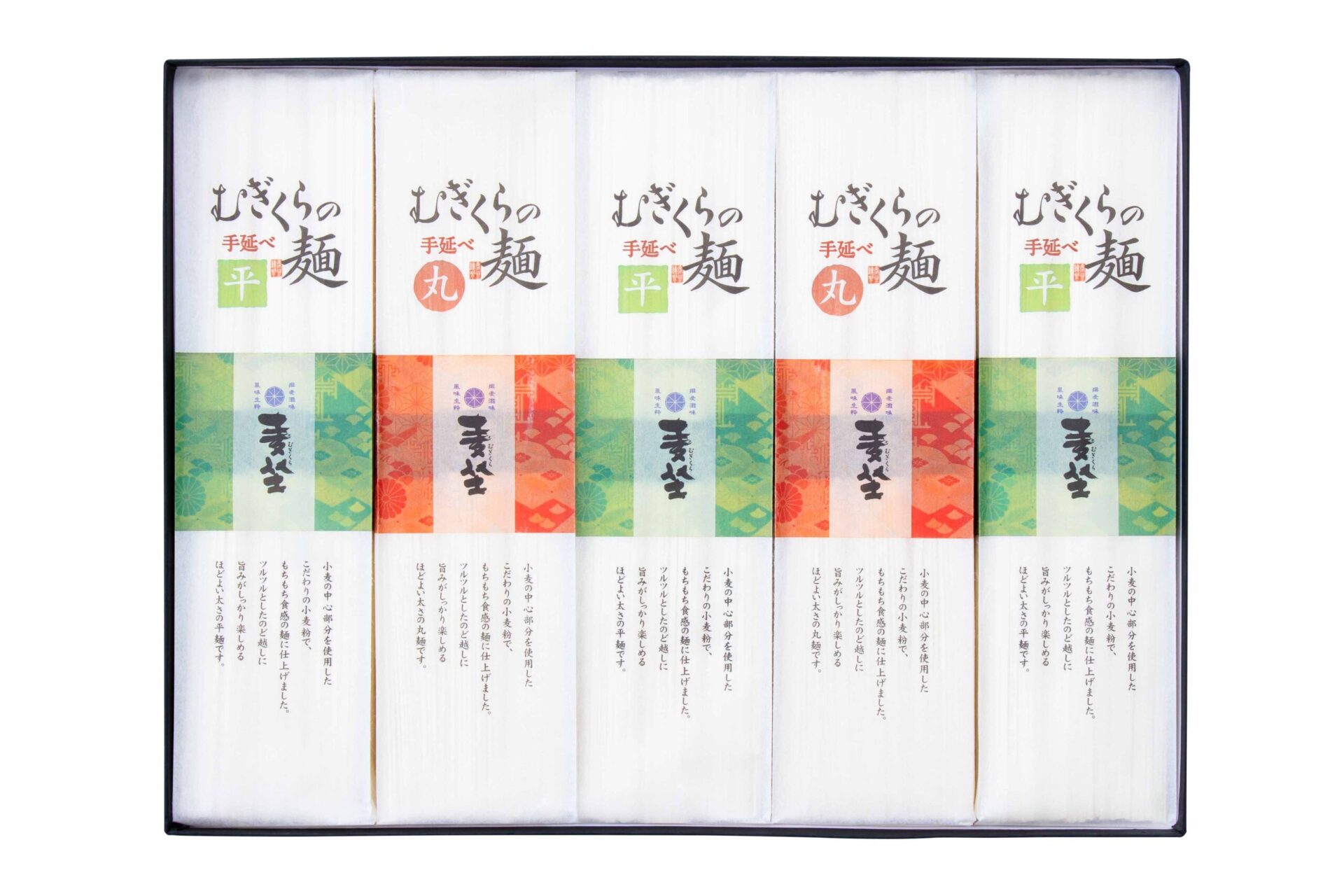 もっちもちの弾力につるつるとした食感とのど越し。麺の旨みがしっかり楽しめる「むぎくらの麺」の丸麺と平麺が入ったギフトセットです。