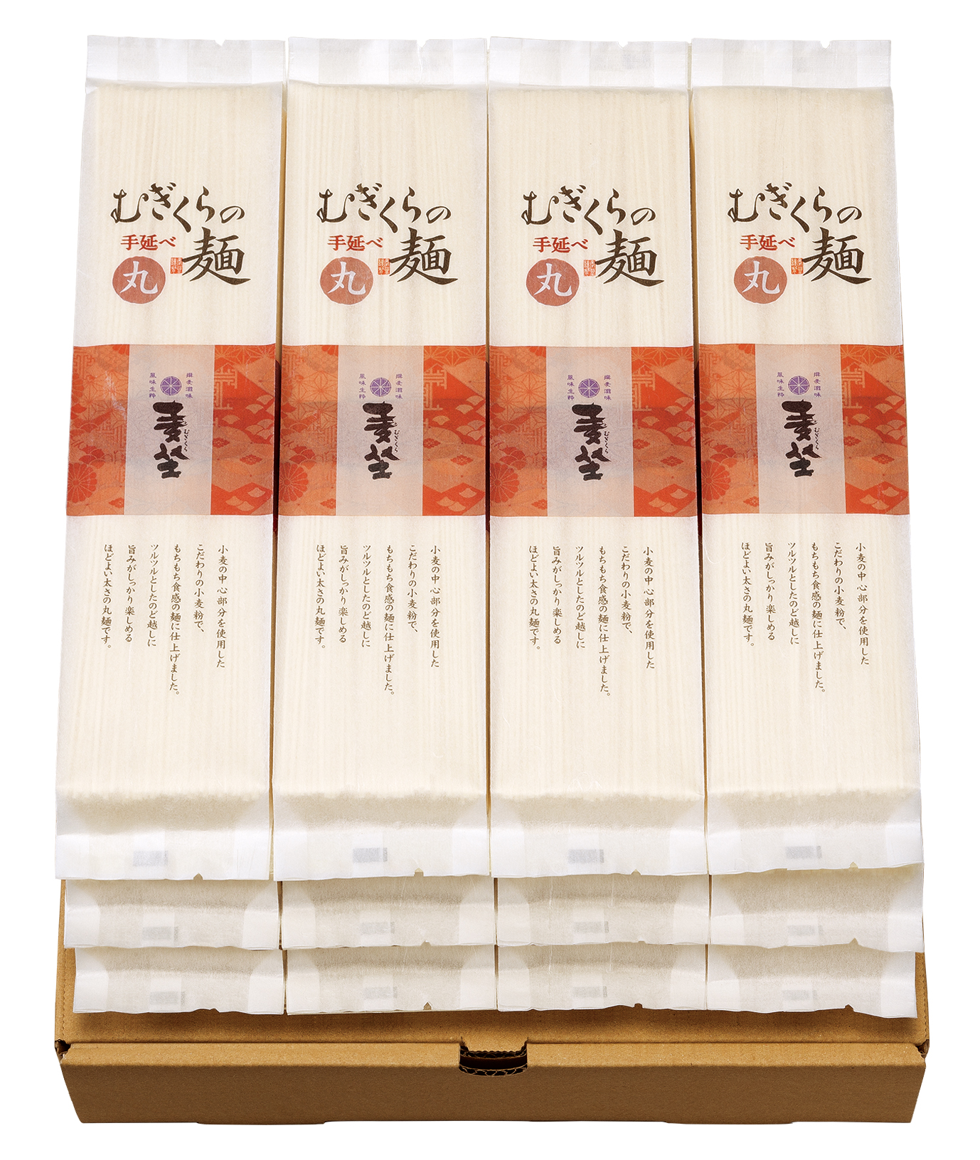 もっちもちの弾力につるつるの食感とのど越し。麺の旨みがしっかり楽しめるむぎくらの麺「丸麺」は毎日食べても飽きないおいしさが身上。ゆであがった麺は水で締めて、あとはお好みで冷やしても温めても。ふだん使いのごちそう麺として人気の手延べ麺です。