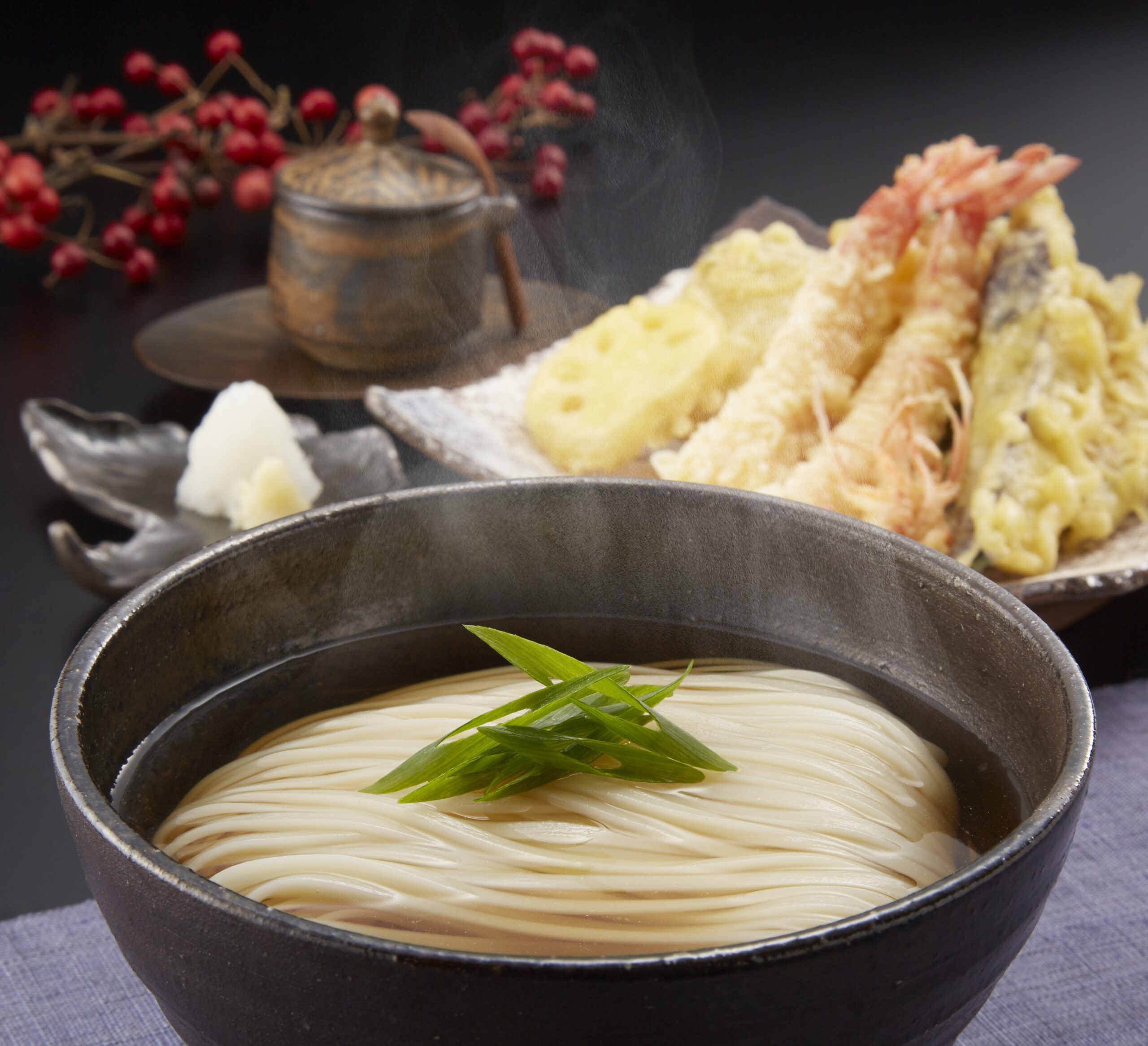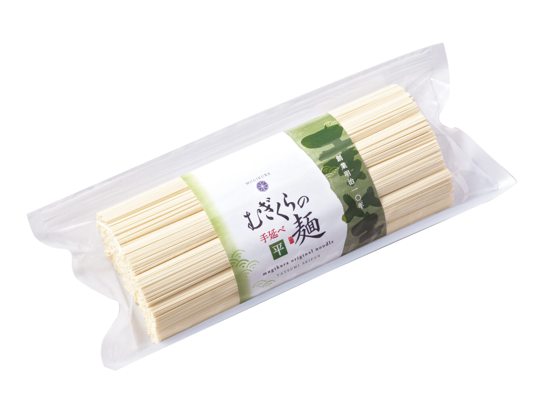 もっちもちの弾力、つるつるの食感、みずみずしい味わいを追求し作り上げたこだわりの手延べ麺です。ゆで上がりの麺の艶は格別。見て美しく、食べて美味しい、思わず笑みが出る。そんな むぎくらの麺「平麺」は1年を通じてどなたさまにもお喜びいただいております。そうめんより食べ応えがあり、うどんよりなめらかな舌触り。冷やせば麺のコシや弾力が際立ち、温めれば麺のつるつるした食感が楽しめるむぎくらの麺をぜひお召し上がりください。