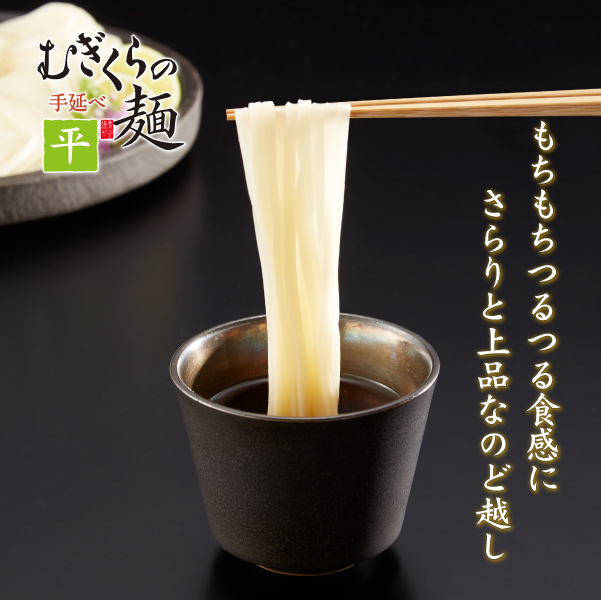 もっちもちの弾力、つるつるの食感、みずみずしい味わいを追求し作り上げたこだわりの手延べ麺です。ゆで上がりの麺の艶は格別。見て美しく、食べて美味しい、思わず笑みが出る。そんな むぎくらの麺「平麺」は1年を通じてどなたさまにもお喜びいただいております。そうめんより食べ応えがあり、うどんよりなめらかな舌触り。冷やせば麺のコシや弾力が際立ち、温めれば麺のつるつるした食感が楽しめるむぎくらの麺をぜひお召し上がりください。